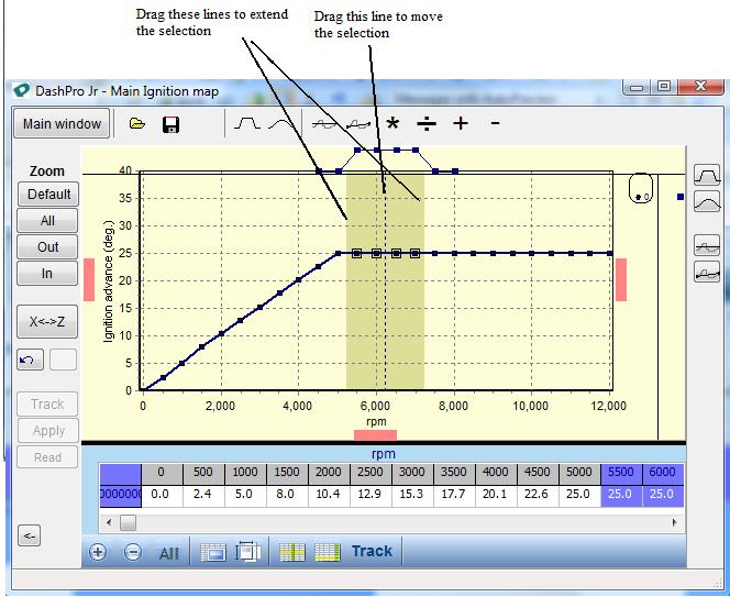 - - Selecting a range of rpm values over which you want to make a modification to the timing curve;